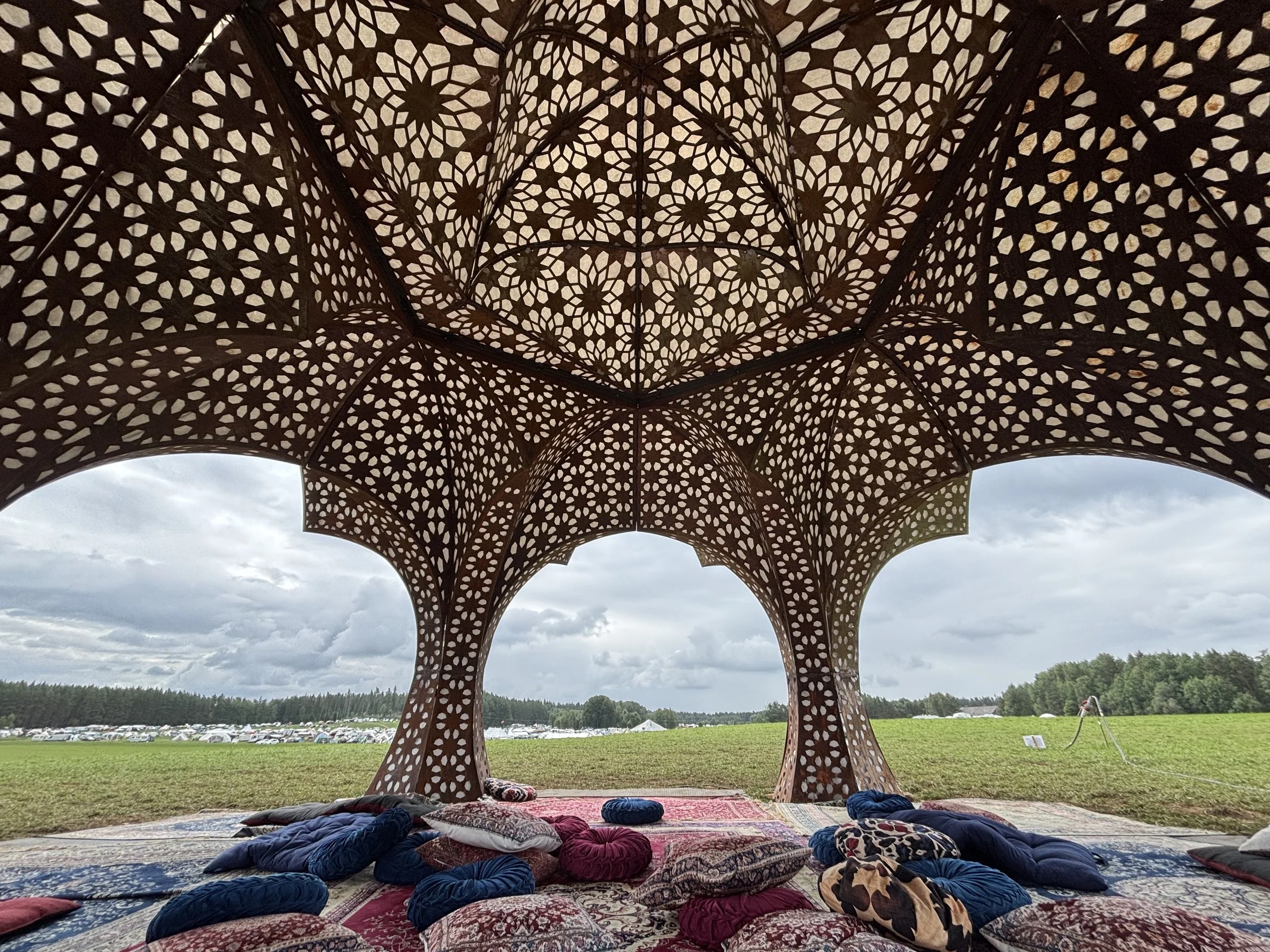 Bayt al-Noor (House of Light) is a permanent communal structure at the Borderland site in Alversjö, Sweden. It’s designed as a cozy lounge where Borderlings can gather, relax, and share quiet moments together under a canopy of light.